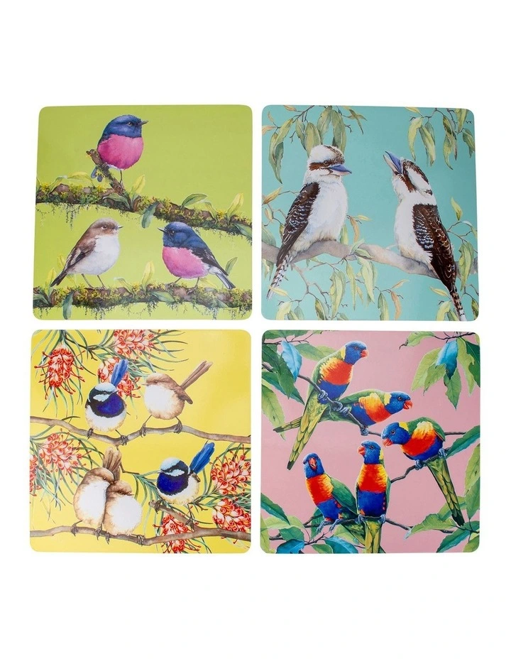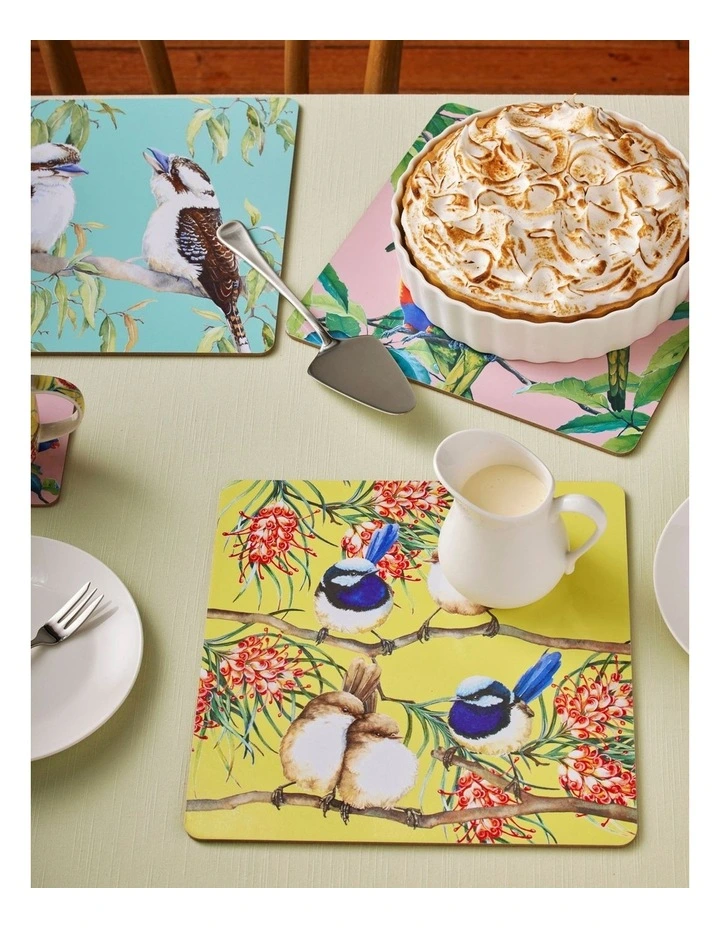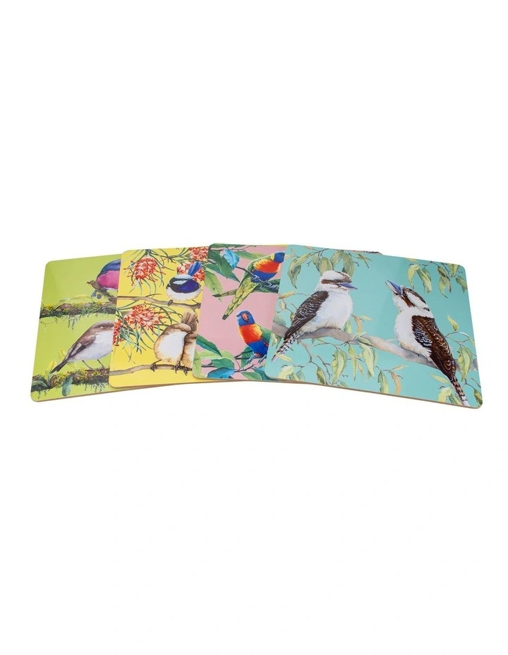 - Set of 4 x 29x29cm placemats, each featuring a different Australian bird