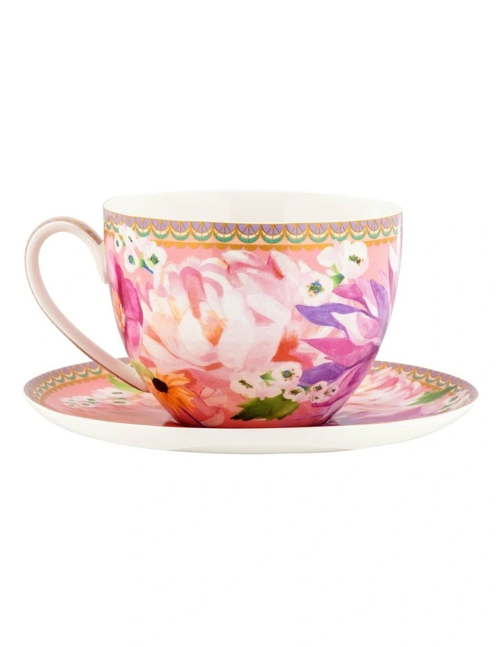 This pink Dahlia Daze breakfast cup & saucer set brings a hint of luxury to the table. Part of the Teas & Cs collection, it features a sumptuous design inspired by fashion and nature. Made from quality porcelain, this beautiful set includes a 400ml teacup and matching saucer, just right for your favourite morning brew. With a palette of rich contemporary colours and embellishments in real gold, its a wonderful gift idea.